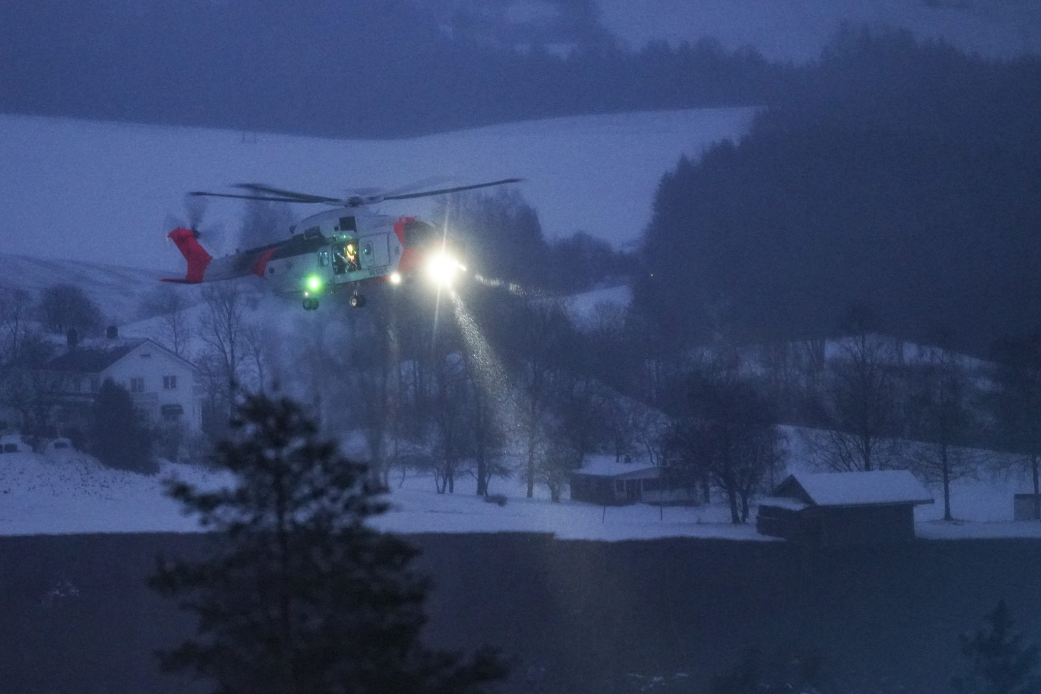 Et redningshelikopter med lyskastere søker i rasområdet i Ask onsdag ettermiddag. Tidlig onsdag morgen ble flere bolighus rammet av et større jord- og leirskred. Foto: Fredrik Hagen / NTB