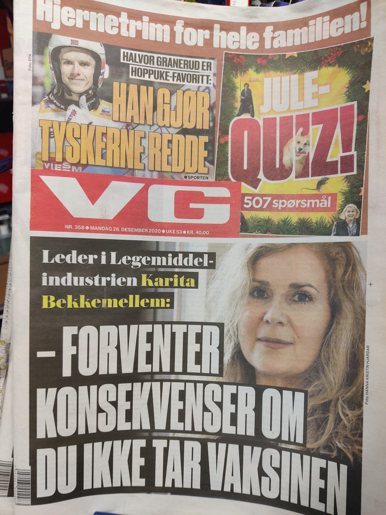 Det har stått i VG, så da må det vel være sant ..? Mandagens forside i VG er et varsel om at vår frihet er i ferd med å bli ofret. Vi vet noe om hvem yppersteprestene er, men den norske offentligheten synes å være vaksinert mot å ville vite. Skjermdump: Verdens Gang, 28.12.20