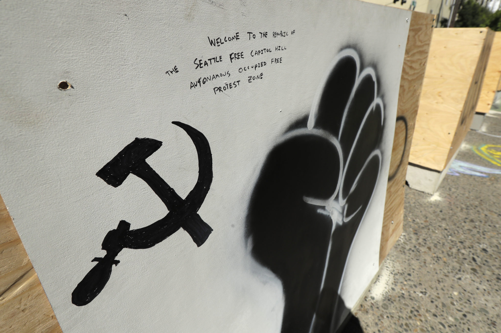 Marxist-symbolet bestående av en hammer og en sigd og black power-symbolet i form av en knyttet neve er malt ved siden av hverandre på en barrikade ved den okkuperte protestsonen i Seattle den 16. juni 2020. Foto: Ted S. Warren / AP / NTB.