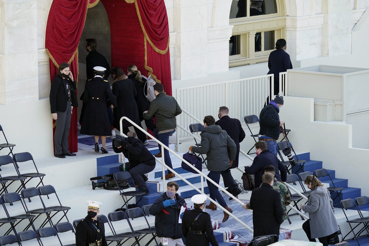Folk forlater en balkong i kongressbygningen mandag ettermiddag. Foto: Carolyn Kaster / AP / NTB