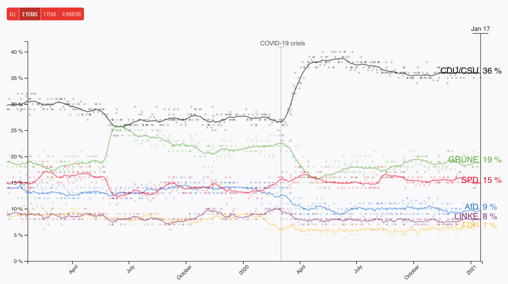 CDU holder enn så lenge koken på meningsmålingene, men de Vries minner om at mye av oppslutningen i øyeblikket kun er til låns fordi folk har sluttet opp om det største regjeringspartiet på grunn av koronakrisen. Før pandemien var den underliggende politiske realiteten at CDU hadde lekket både til AfD og De grønne. Og ved valget i 2017 hadde CDU gått tilbake med nesten ni prosentpoeng.