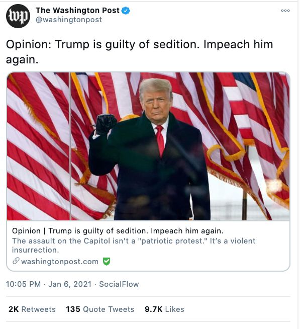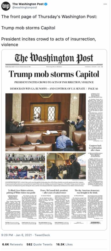 9:29 PM: The Washington Post blames Trump for starting an “insurrection.” The rest of the media adopt the word to characterize the riot.
