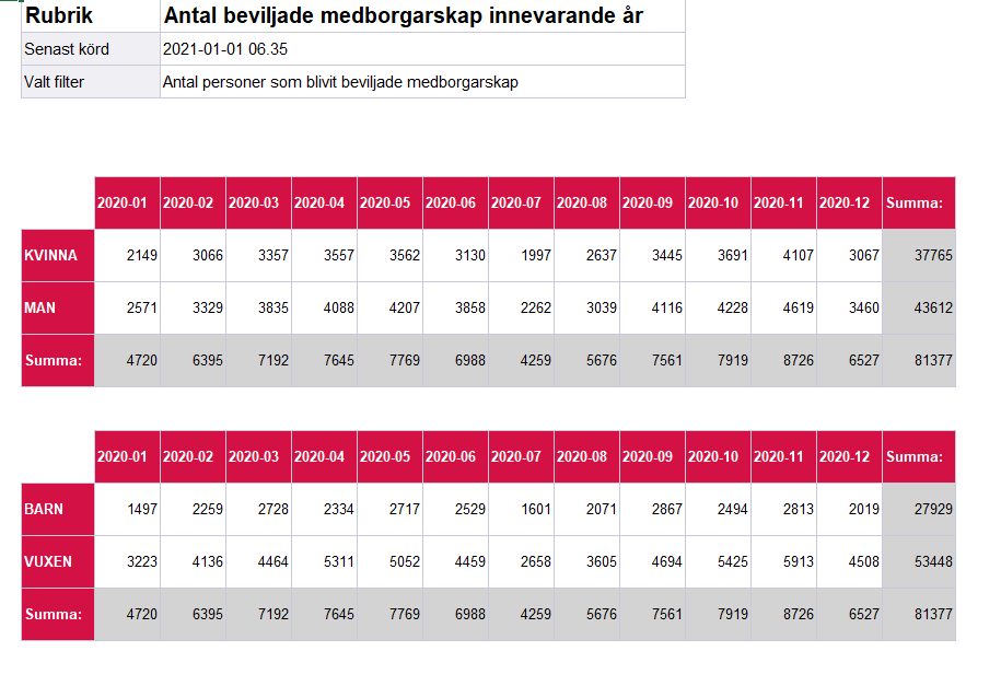 «Antalet ansökningar om svenskt medborgarskap låg under året på en fortsatt historiskt hög nivå och medborgarskapsärenden är sedan en tid tillbaka det största ärendeslaget på Migrationsverket sett till antalet ansökningar. Detta beror främst på det stora antalet personer som beviljades uppehållstillstånd i Sverige inom främst asylprocessen under mitten av 2010-talet och som nu ansöker om medborgarskap.»