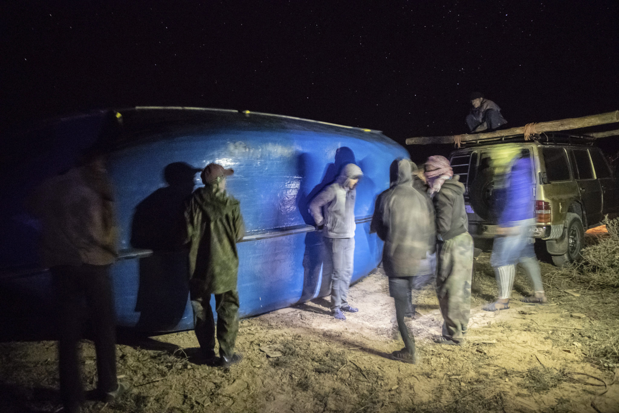 Menneskesmuglere er i ferd med å laste en båt på et kjøretøy i ørkenen utenfor Dakhla i Vest-Sahara den 22. desember 2020. Foto: Mosa’ab Elshamy / AP / NTB.