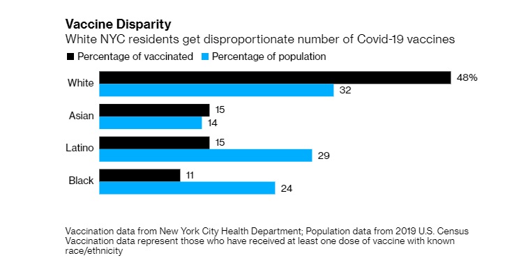 Borgermesteren i New York, Bill de Blasio, sa under en pressekonferanse at de hadde et stort problem med mistillit og nøling, særlig blant «communities of color». Tallgrunnlaget er heller ikke av de beste: Hele 40 prosent av dem som har fått en vaksinedose, har ikke registrert rase eller etnisitet.