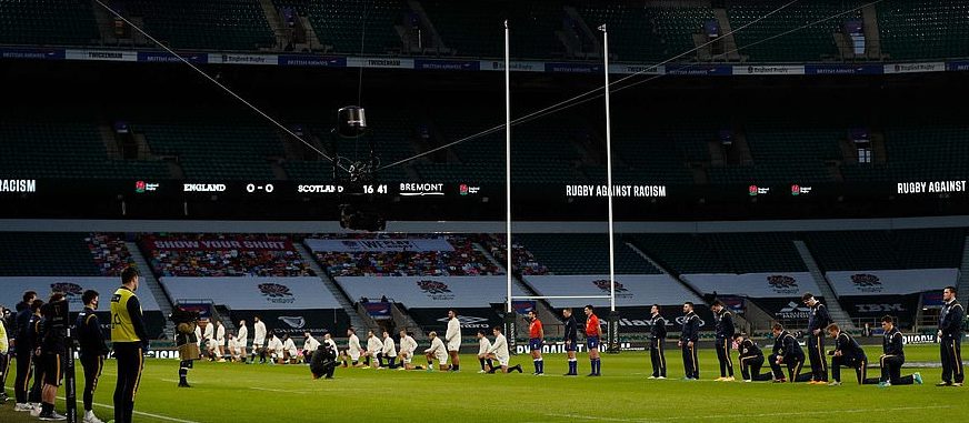 I rugbykampen mellom Skottland og England lørdag 6. januar valgte halvparten av spillerne å bli stående i stedet for å knele for BLM. På det engelske laget knelte de fleste, men blant skottene var det bare fire spillere som gikk ned på kne.