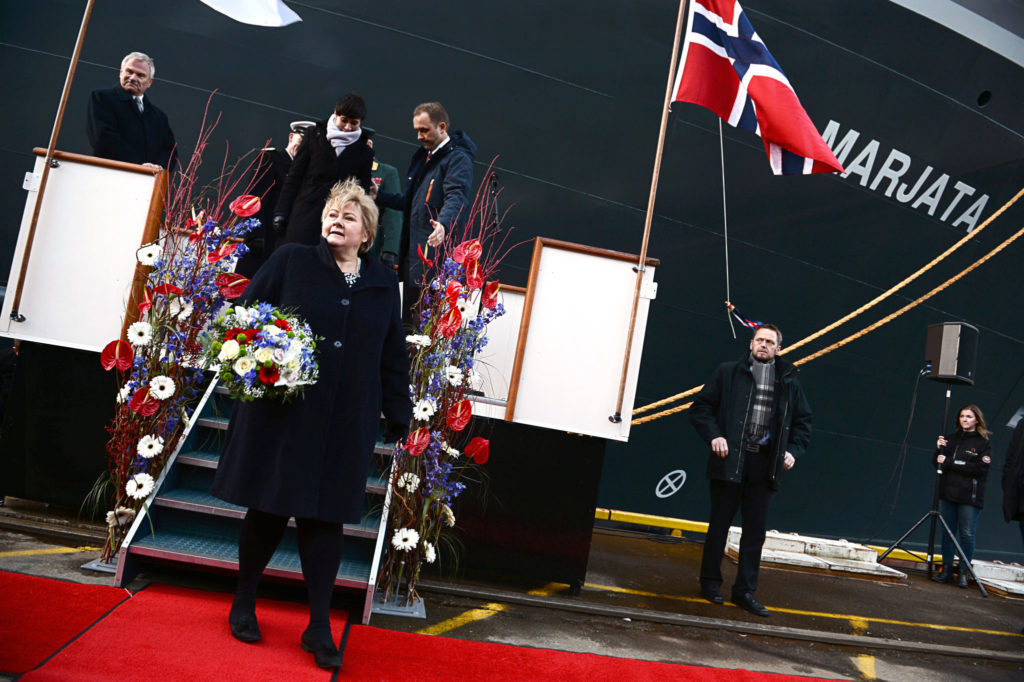 Statsminister Erna Solberg døper etterretningstjenestens skip Marjata. Foto: Erik Birkeland / Romsdals Budstikke / NTB.