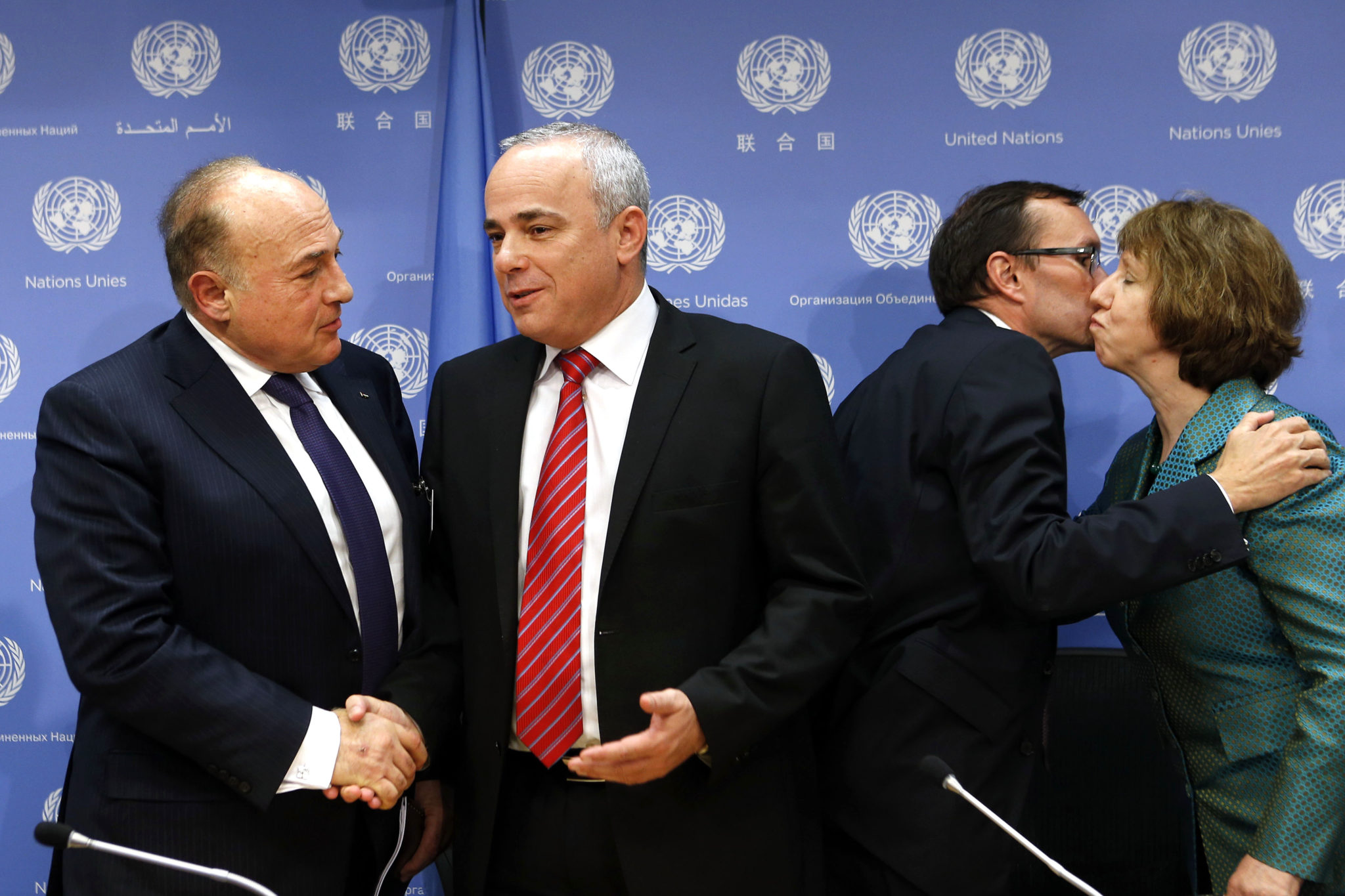 Bildet er fra 2013, men er likevel illustrerende: Israels utenriksminister Yuval Steinitz (rødt slips) i prat med den palestinske finansministeren Shukri Bishara (t.v) og i bakgrunnen daværende utenriksminister Espen Barth Eide som nusser med EUs utenriksansvarlige Catherine Ashton. All pussingen ble et politisk kontaktsignal, omtrent som vennlighetstegn mellom chimpanser. Men det er en reversering til noe før-sivilisatorisk. Møtet fant sted under FNs hovedforsamling i 2013. Foto: Jason DeCrow/AP/Scanpix