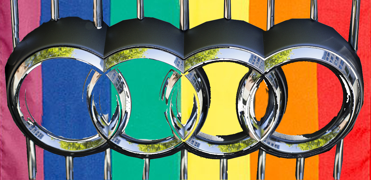 Foto av Audi-grill med logo: Markus Schreiber / AP / NTB. Komposisjonen med regnbuens farger er Documents.