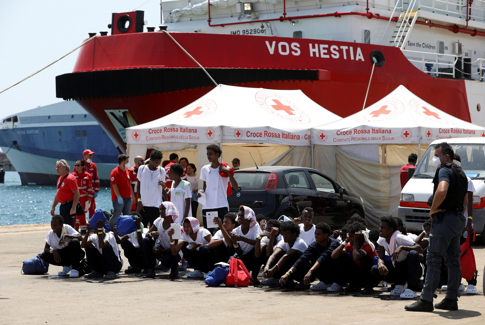 Migranter er gått i land på havnen i Augusta på Sicilia fra skipet «Vos Hestia» som drives av Redd Barna den 4. august 2017. Foto: Antonio Parrinello / Reuters / NTB.