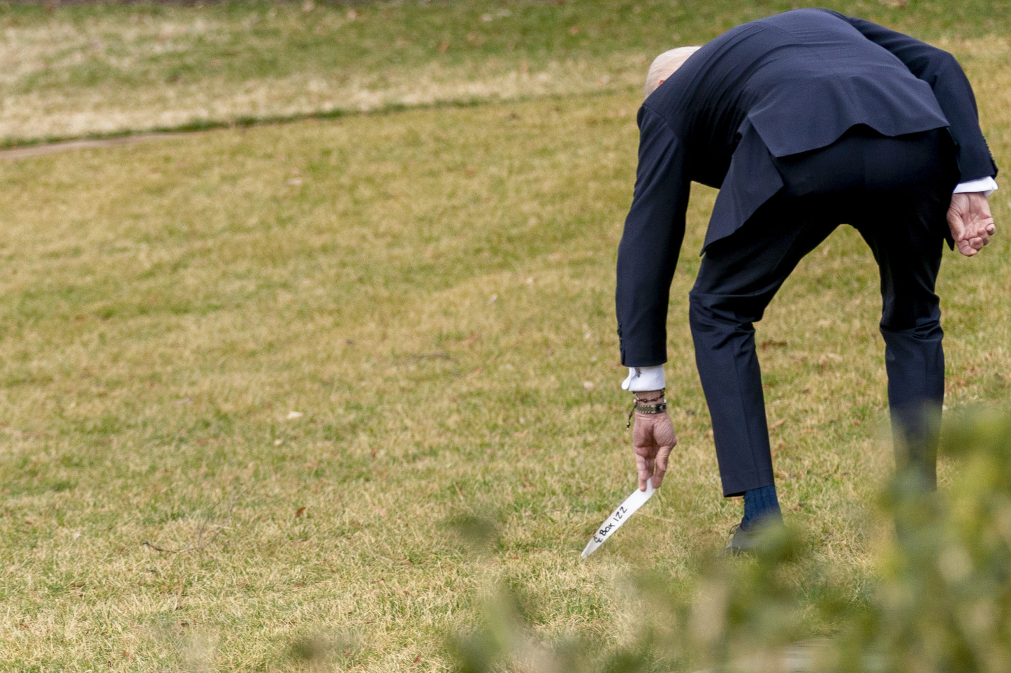Joe Biden finner noe på bakken på plenen utenfor Det hvite hus onsdag 17. mars etter å ha vendt tilbake fra Wilmington, Del. Foto: Andrew Harnik/AP/NTB