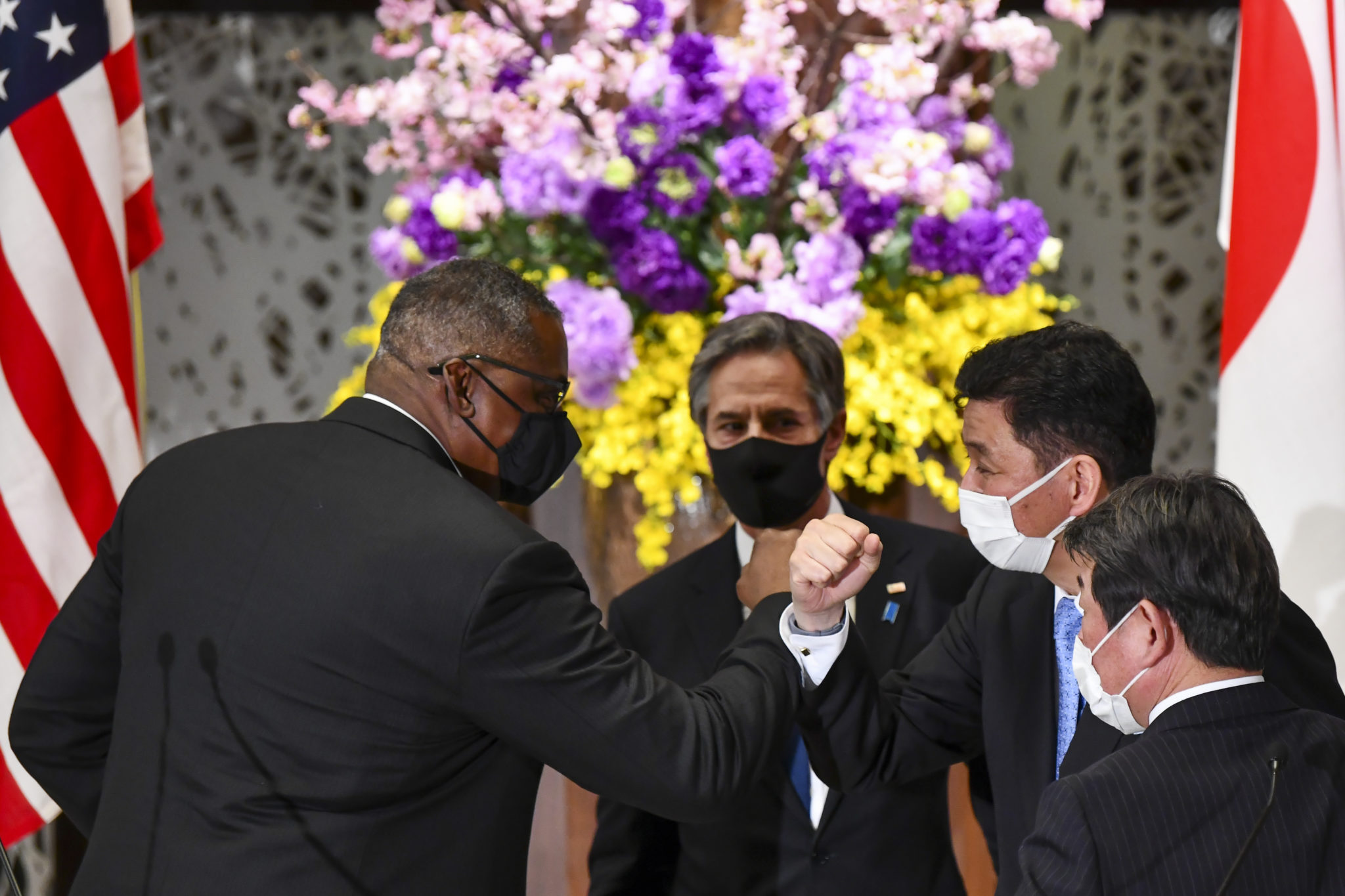 USAs forsvarsminister Lloyd Austin (t.v.) hilste tirsdag på Japans forsvarsminister Nobuo Kishi sammen med USAs utenriksminister Antony Blinken (i midten) og Japans utenriksminister Toshimitsu Motegi. Kina anklaget onsdag USA og Japan for å ha inngått en sammensvergelse. Foto: Kazuhiro Nogi / AP / NTB