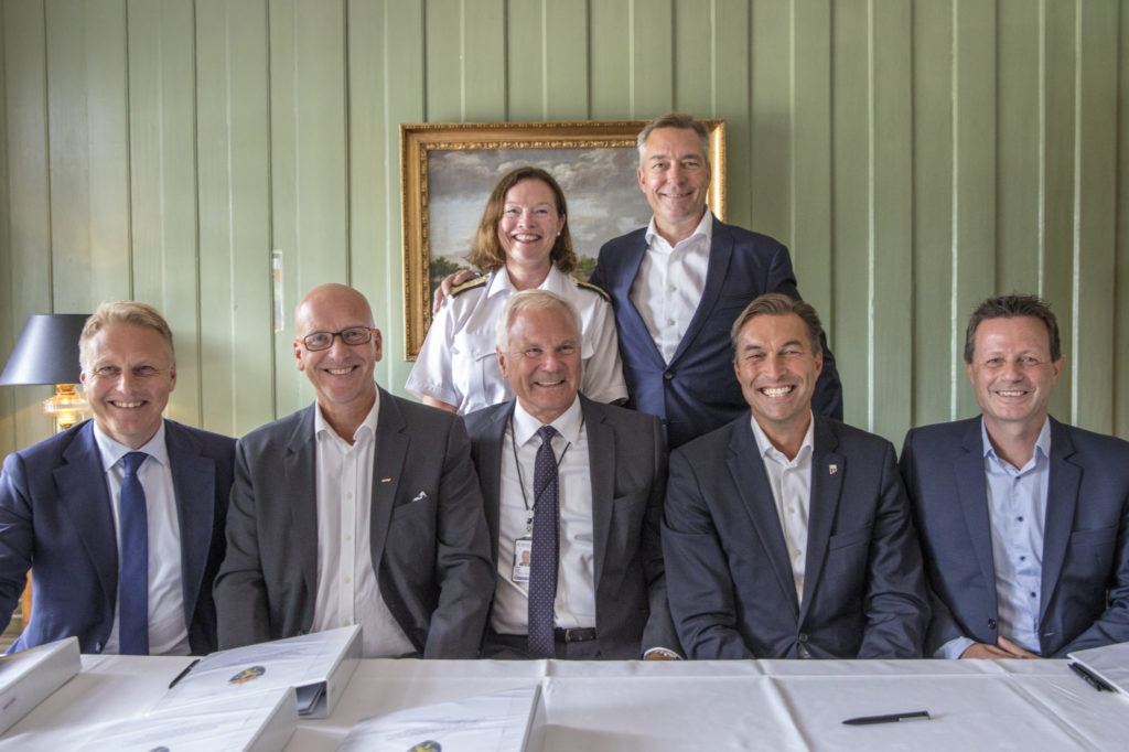 Forsvaret inngår beredskapsavtaler for matvarer 20. august 2019. Avtaleparter er matvaregrossistene NorgesGruppen, COOP, Rema og Servicegrossistene. Forsvarsminister Frank Bakke-Jensen deltok sammen med ledende representanter fra de fire matvaregrossistene. Fra venstre: Trond Bentestuen, adm.dir. Rema 1000, Geir Inge Stokke, konsernsjef Coop, Petter Jansen, administrerende direktør i FLO, Jan van der Burg, adm.dir. Servicegrossistene, og konsernsjef i Norgesgruppen ASA, Runar Hollevik Foto: Ole Berg-Rusten / NTB