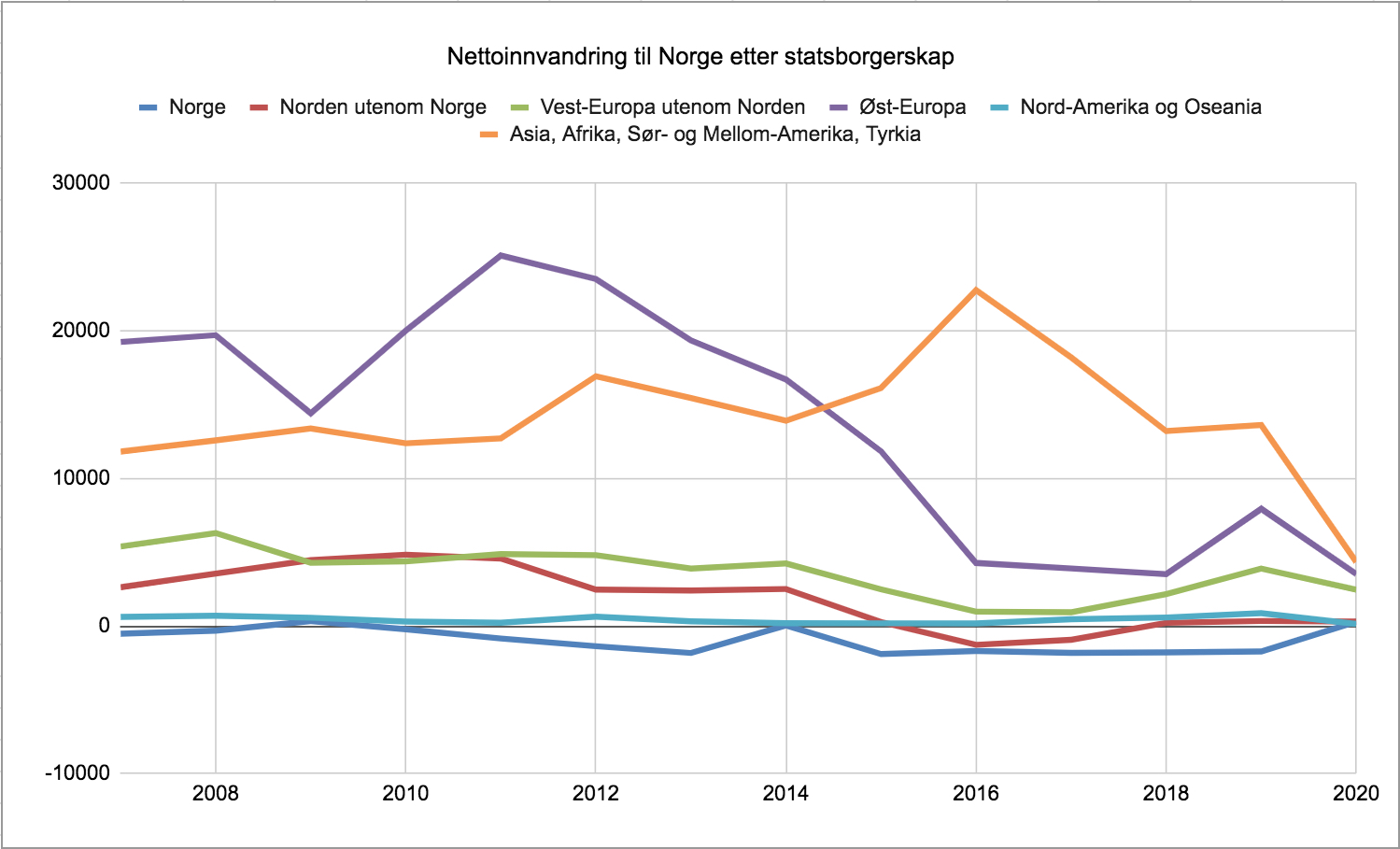 Hovedbildet som avtegner seg, er at nettoinnvandringen gikk klart ned i 2020. For mens nettoinnvandringen til Norge var på ca. 25.000 personer i forfjor, var den litt over 11.000 i fjor.
