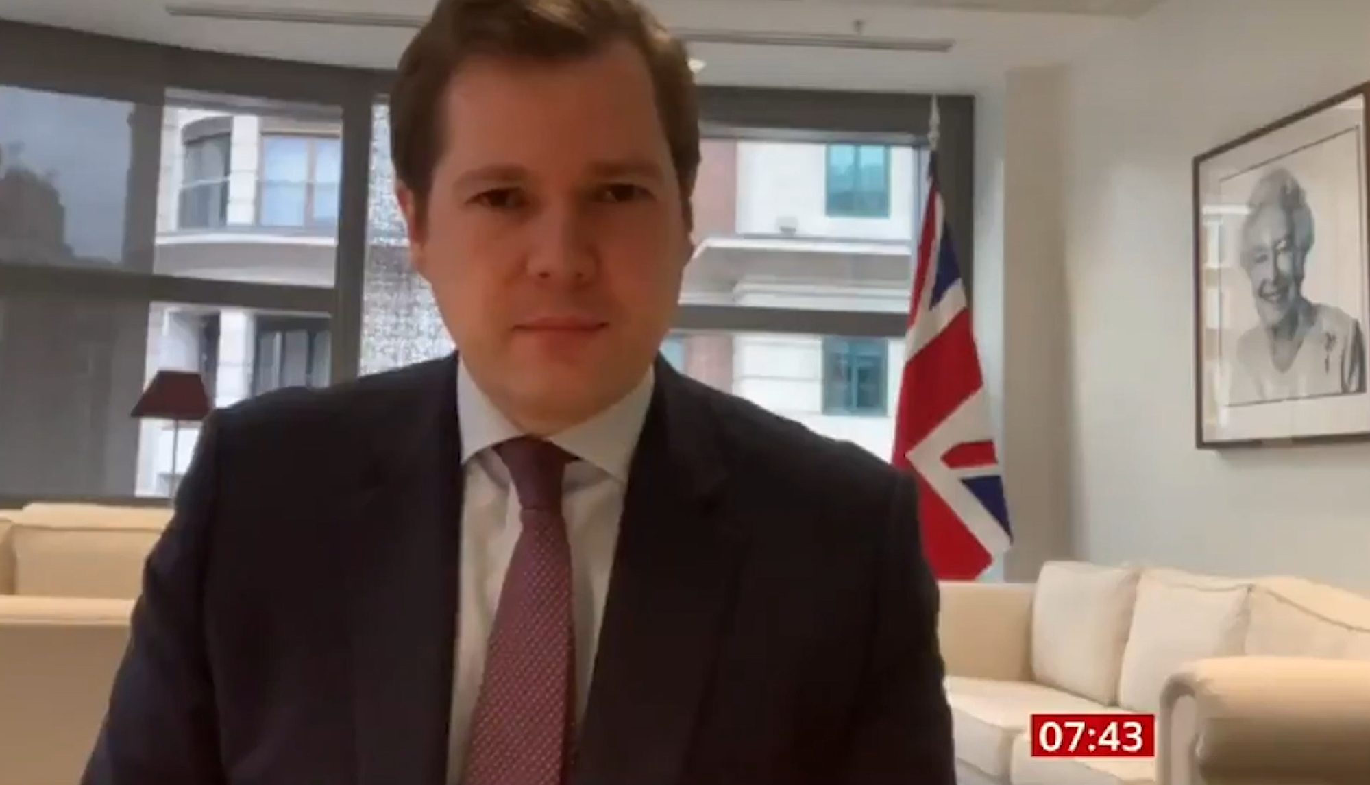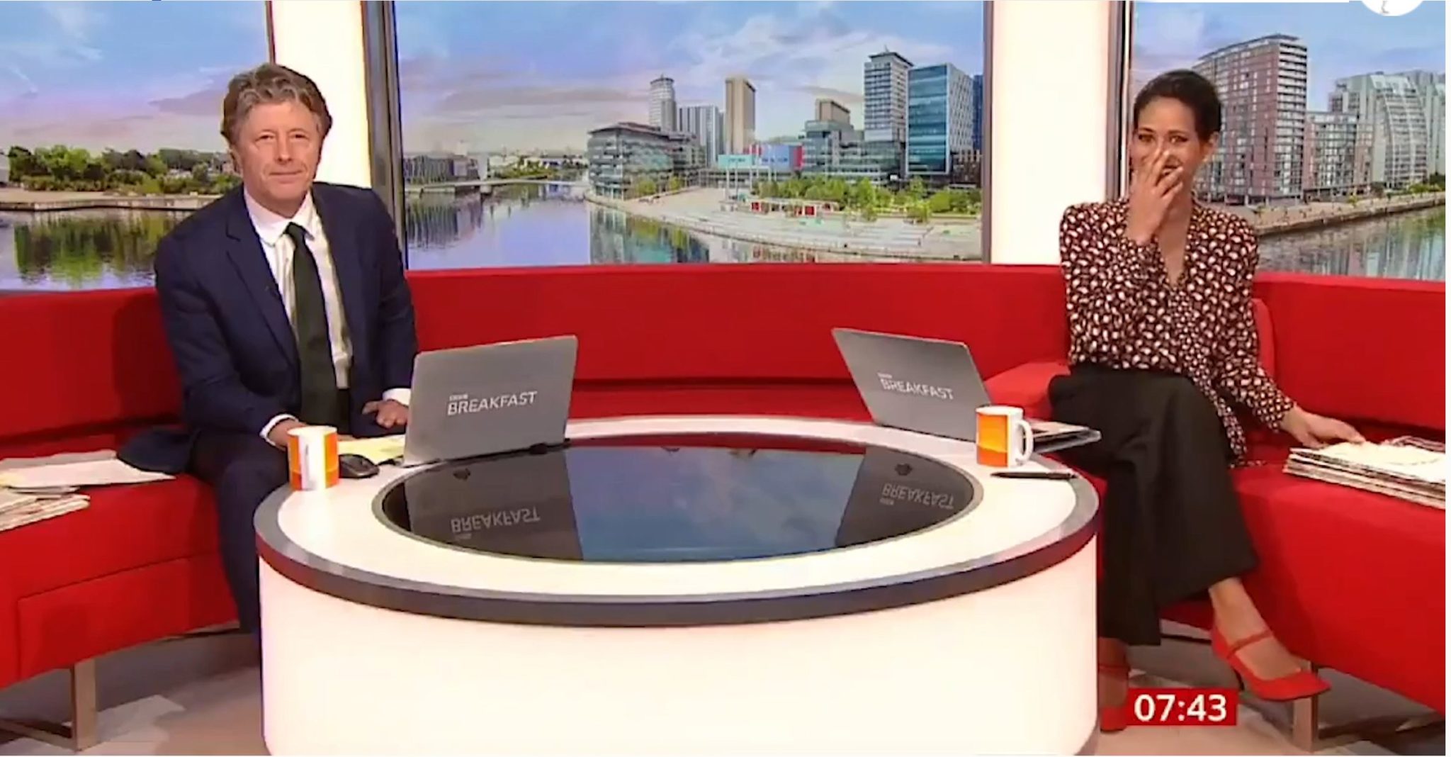 Samfunnsminister Robert Jenrick ble intervjuet av BBC Breakfast-reporterne Charlie Stayt og Naga Munchetty. I bakgrunnen hadde han et bilde av dronningen og et stort Union Jack-flagg. Dette spøkte og lo de to reporterne av.