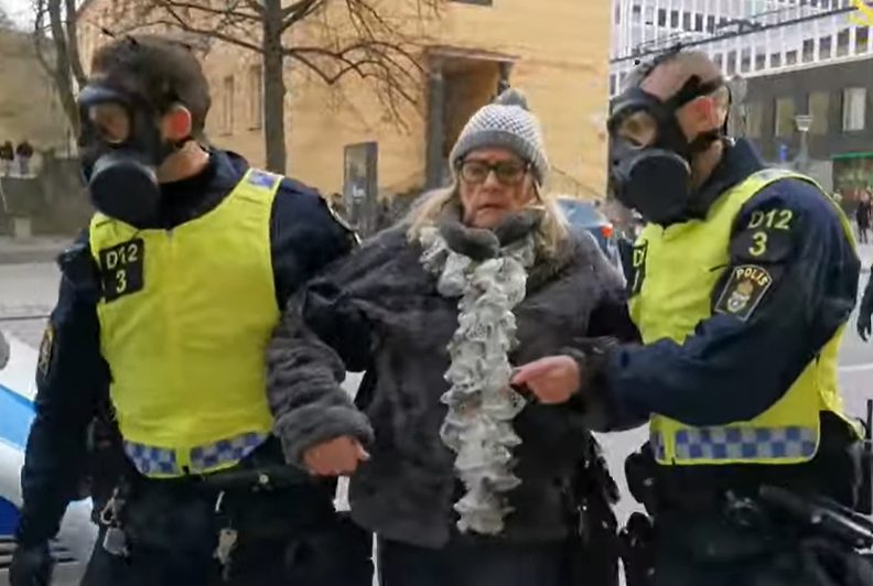 Inga-Britt Törnlind (76) demonstrerte mot den svenske regjeringens koronatiltak, mens hun viftet med et svensk flagg. Da ble hun pågrepet av politi iført gassmasker. Nå stiller hun spørsmålet: Hvorfor ble ikke Black Lives Matter-demonstranter pågrepet?