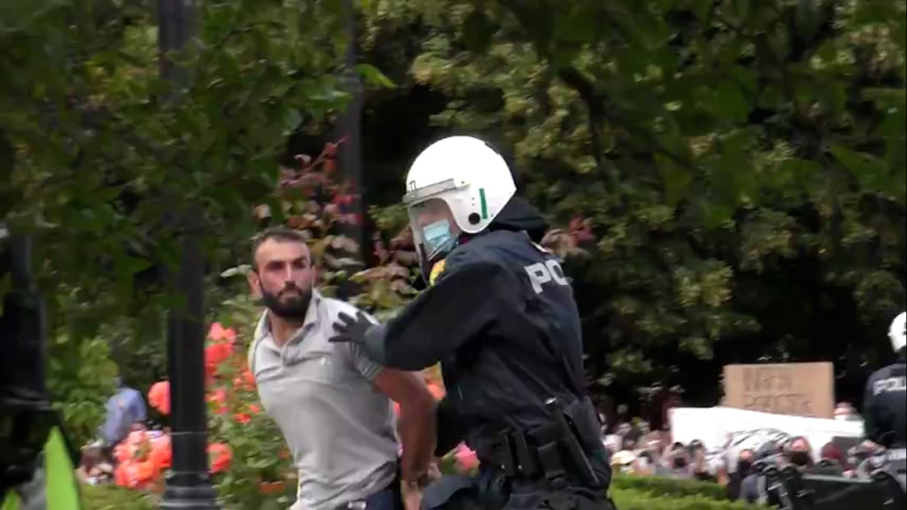 Mannen som utøvde vold mot Sian-meldem Fanny Bråten, blir ført forbi Sian-medlemmene etter å ha hoppet over sperringene som skilte Sian og motdemonstrantene. Foto: Stillbilde fra video.