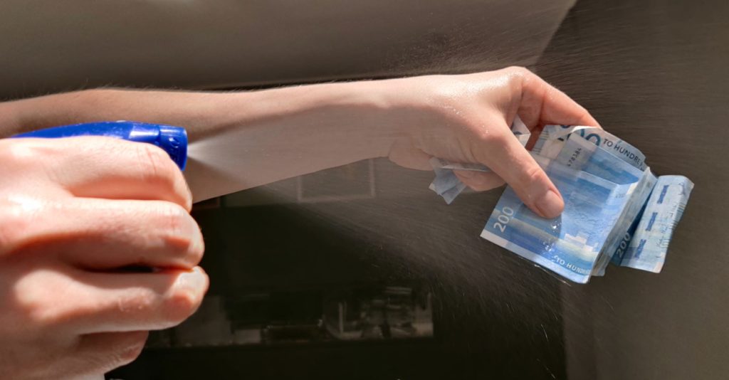 Og da jeg skulle betale, sprayet han sedlene til de dryppet av antibac.