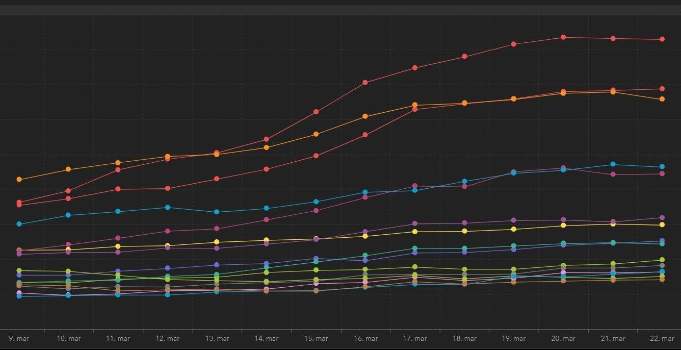Smittetrend per bydel i Oslo, antall smittede 9.–22. mars per 100.000 innbyggere. Øverst ligger Stovner, tett bak følger Grorud og Alna, deretter Bjerke og Søndre Nordstrand, som inkluderer Holmlia. Fra Oslo kommunes koronastatistikksider.