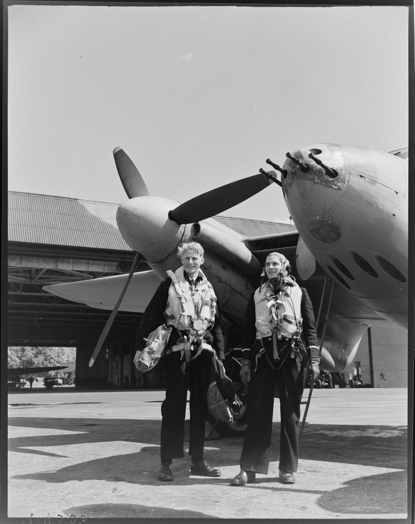 Storbritannia 1944 0404. En norsk rekognoseringssquadron i Coastal Command, som særlig opererer på Norskekysten, bruker blant annet Moskuito-fly i denne tjenesten. Squadronen er «all Norwegian» – ikke bare luftpersonellet, men også hele bakkemannskapet er norsk. Turene til Norge fører ofte til kamp med tyske fly, og de norske flygerne har allerede en meget pen scoringsliste. På bildet ser en en av de norske Mosquitosene og flygerne før dagens tripp. (Original bildetekst, London, 4.4.44) Foto: Ukjent / Krigsarkivet / NTB