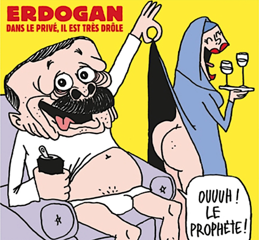 Charlie Hebdo besvarte den tyrkiske president Erdogans utfall mot Frankrike og Macron med en karikatur.