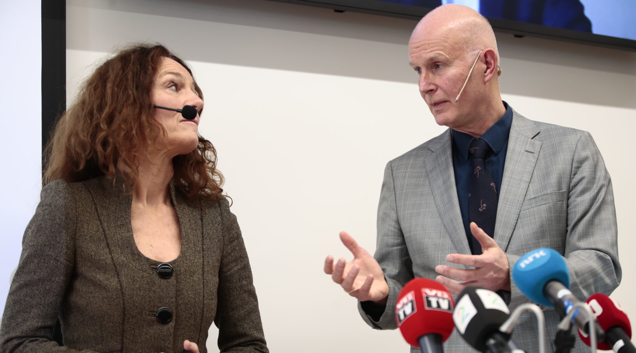 Helsedirektør Bjørn Guldvog og direktør i Folkehelseinstituttet Camilla Stoltenberg på en av mange pressekonferanser om Covid-19. Foto: Lise Åserud / NTB scanpix