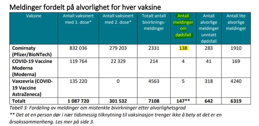 Det må presiseres at dødsfall etter vaksine kan ha andre, underliggende årsaker. Det samme gjelder selvsagt for de som dør med påvist Covid-19, men dette er ikke alle medier alltid like nøye med å presisere.