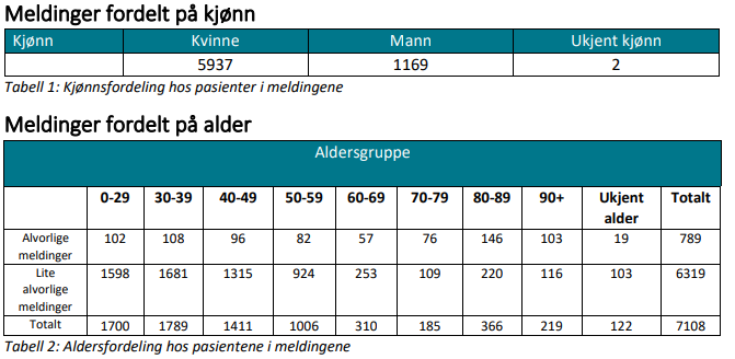 Det er interessant å se bivirkningene fordelt etter alder og kjønn. Bivirkningene er nokså jevnt fordelt på de ulike aldersgruppene, selv om en stor andel av de vaksinerte tilhører de eldre aldersgruppene. Og kvinner opplever markant oftere bivirkninger enn menn.