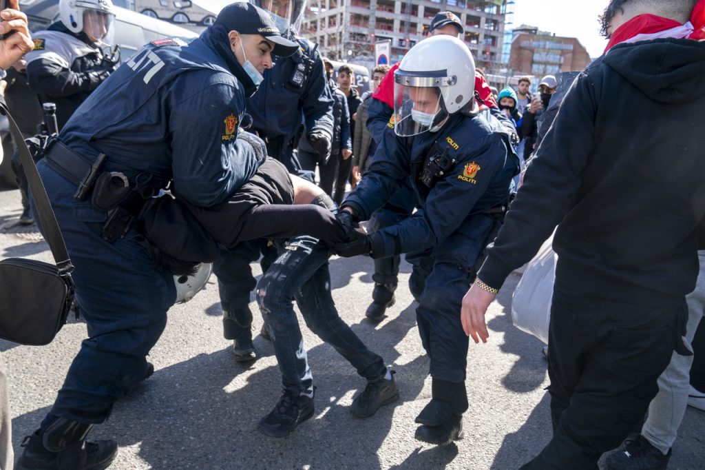 Motdemonstranter prøvde å stoppe SIANs møte i Drammen. Foto: Heiko Junge / NTB.