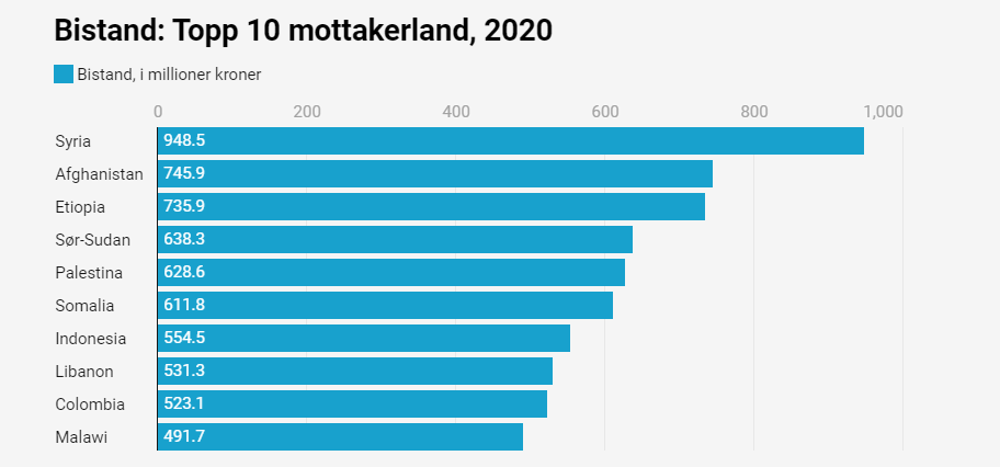 At Syria topper statistikken, er forståelig, men hva vil skje med Afghanistan når Taliban ser ut til å overta makten? Legg også merke til at Etiopia mottok nær trekvart milliard kroner i bistand i 2020. Så lenge Etiopias fredsprisvinner fra 2019 og diktatoren i Eritrea nå står sammen om krigsforbrytelser i Tigray, bør denne støtten stoppes med umiddelbar virkning.