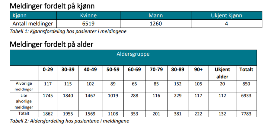 Det er klart flest bivirkninger blant kvinner, nesten fem ganger flere enn hos menn. Hva alder angår er bivirkninger rapportert nokså jevnt i alle aldersgrupper, da med unntak av dødsfall.