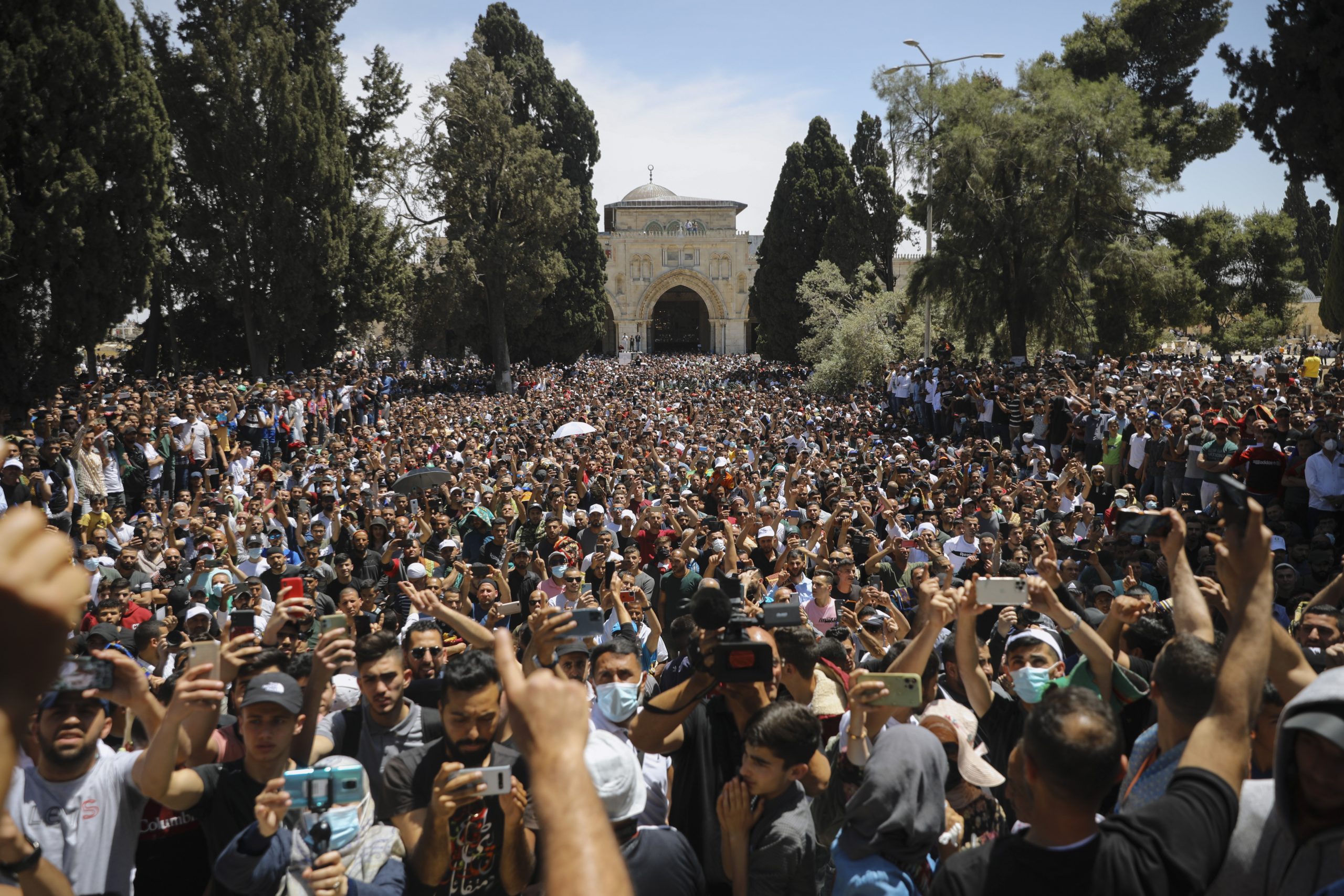 Worshippers chant slogans during a protest against the likely evictions of Palestinian families from their homes, after the last Friday prayers of the Muslim holy month of Ramadan at the Al Aqsa mosque compound in the Old City of Jerusalem, Friday, May 7, 2021. (AP Photo/Mahmoud Illean)