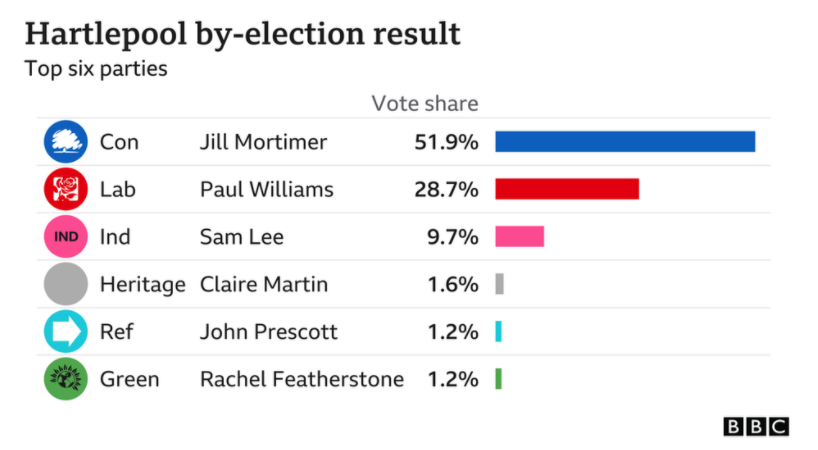 Suppleringsvalget torsdag i Hartlepool gikk i de konservatives favør, med stor margin. Hartlepool er en viktig symbol-seier for Boris Johnson. Ikke bare har Hartlepool vært rød siden 1974, men det er faktisk også bare andre gang på førti år at et regjeringsparti har greid å ta et sete fra opposisjonen.