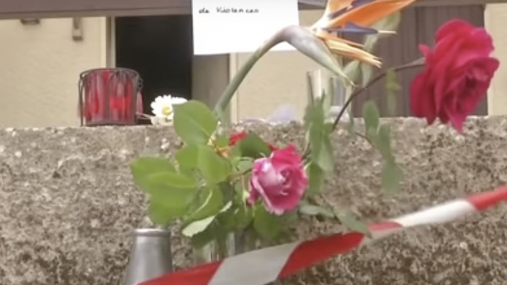 Blomster ved politisperringen på åstedet der Chazinez (31) ble brent levende i Merignac den 4. mai 2021. Stillbilde: RMC / YouTube.