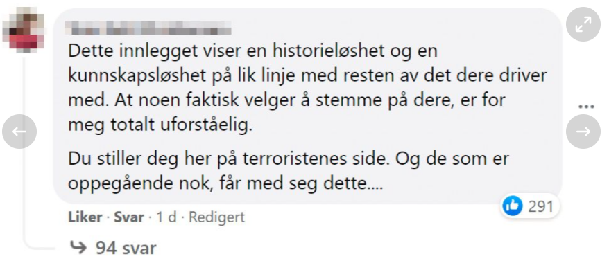 Flere kommentarer har mange hundre likes, samtlige er kritiske til MDG-politikeren. Mange er sterkt uenige med henne, men alle holder seg til saken. Jeg fant ikke et eneste personangrep. Det gjorde heller ikke Simen Sandelien:
