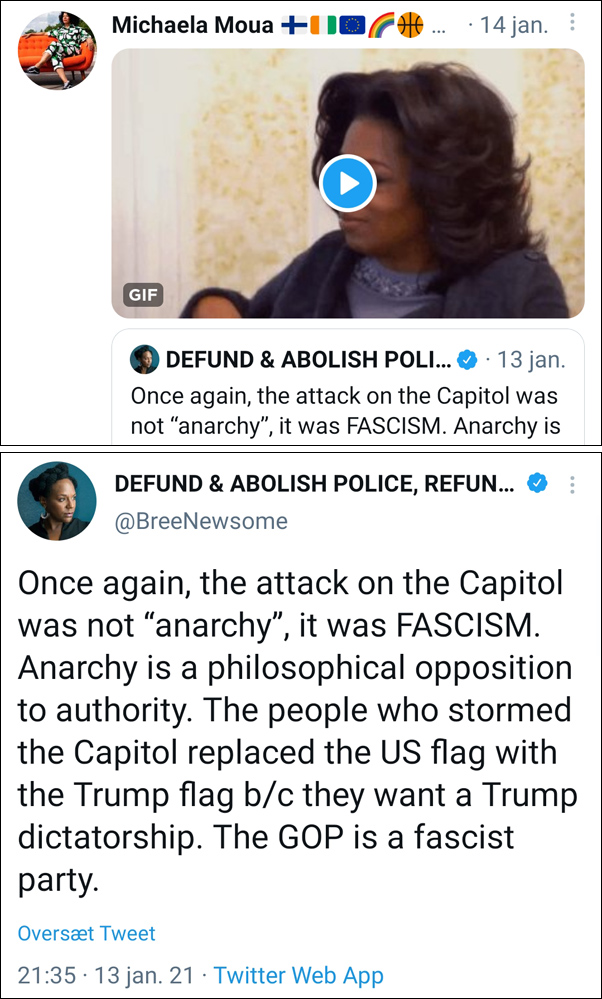 “Once again, the attack on the Capitol was not ‘anarchy’, it was FASCISM. Anarchy is a philosophical opposition to authority. The people who stormed the Capitol replaced the US flag with the Trump flag b/c they want a Trump dictatorship. The GOP is a fascist party.“ (Michaela Moua rt:, 13. januar 2021)