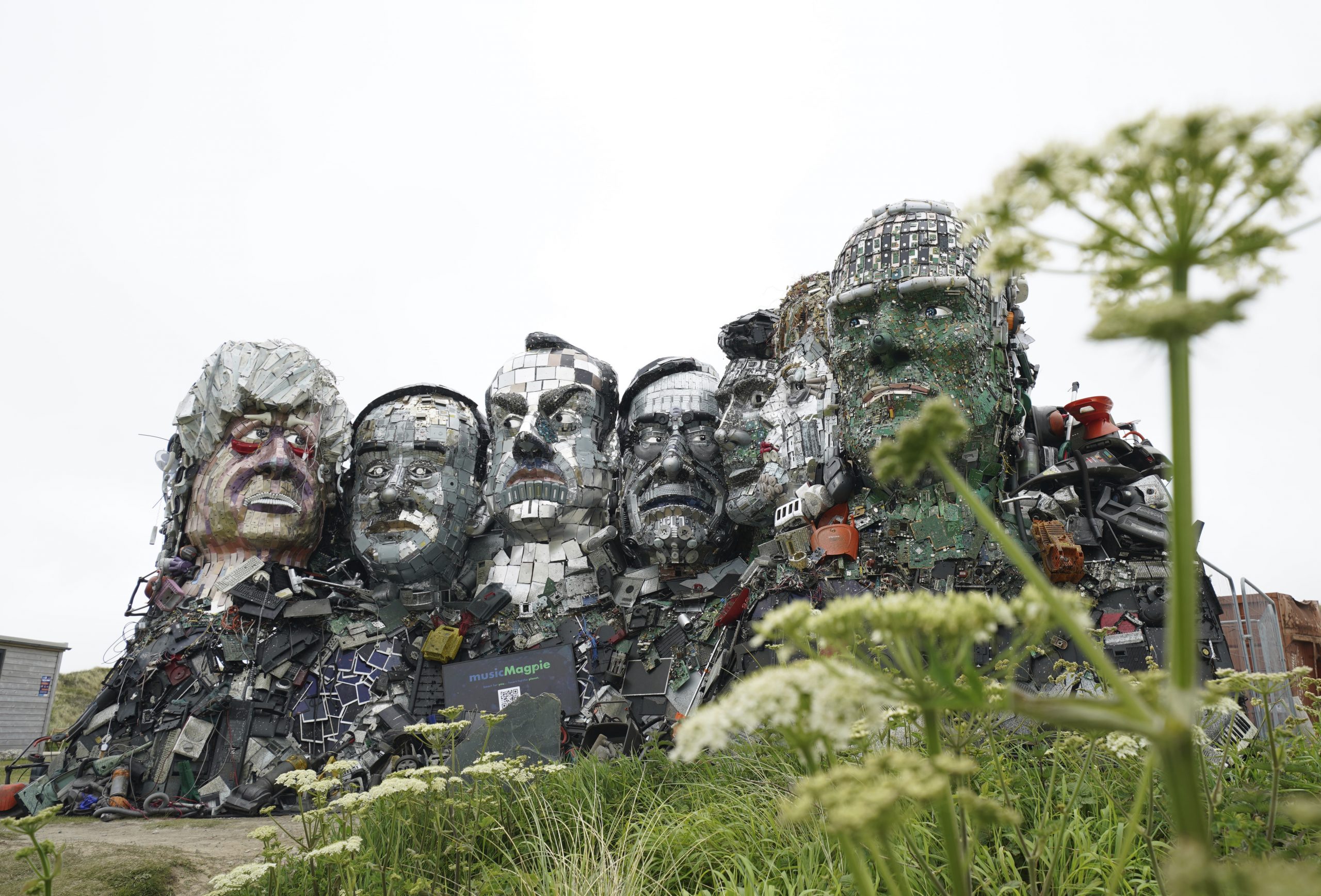 En Mount Rushmore-inspirert skulptur laget av elektronisk forfall som forestiller G7-lederne, er satt opp på en bakketopp i nærheten av Cornwall i forkant av G7-møtet som skal finne sted i Carbis Bay den 11. juni. Verket er fremstilt av kunstnerne Joe Rush og Alex Wreckage. Foto: Jon Super / AP / NTB.
