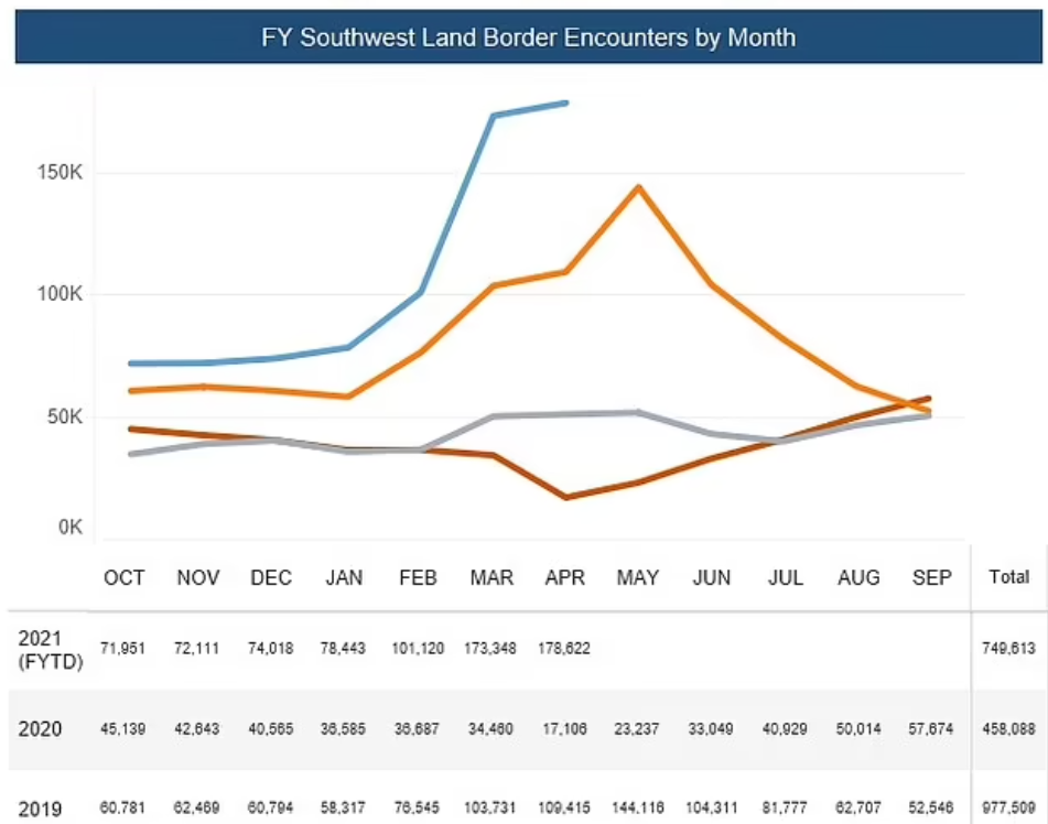 Antallet illegale migranter som har kommet til USA etter Bidens og Harris’ grenseløse naive politikk, har skutt i været siden januar 2021 (blå linje). 180.034 illegale migranter ble registrert på USAs grense i mai-måned. Det er 674 prosent mer enn i mai i fjor.