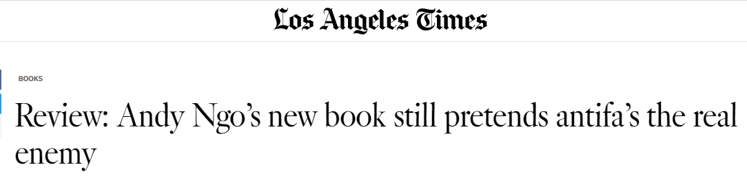 Bokanmelderen i Los Angeles Times, Alexander Nazaryan, hadde allerede en klar mening om Andy Ngo. Han er på Antifas side. Nazaryan er også en korrespondent for Det hvite hus på vegne av Yahoo News og er forfatter av boken: “The Best People: Trump’s Cabinet and the Siege on Washington”. Boken er et eneste langt angrep på Trump og får naturligvis strålende anmeldelse i The Guardian.