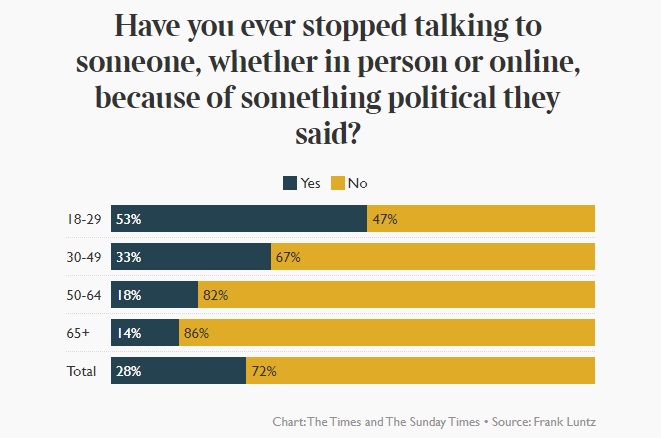 En undersøkelse i The Times viser at halvparten av de unge gjerne blokkerer dem som de ikke er politisk enige med:
