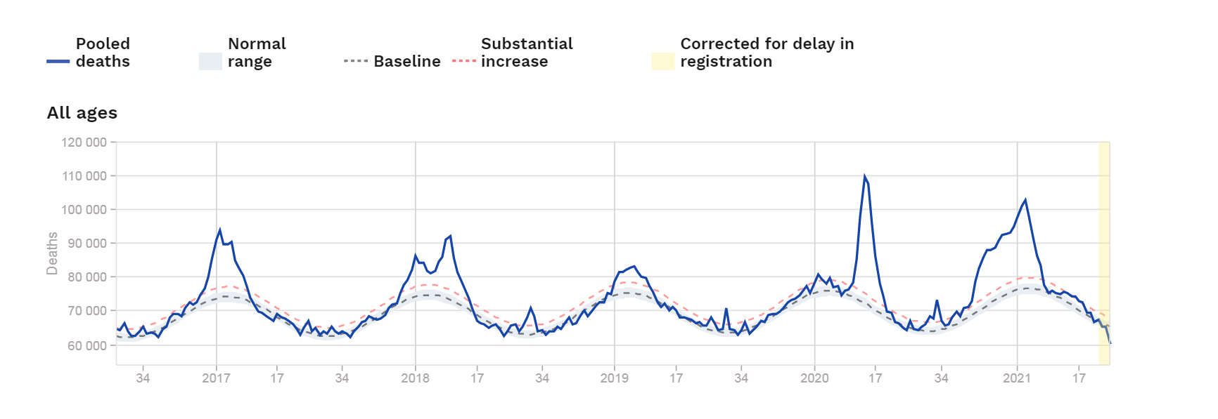 Det var også en vesentlig overdødelighet vinteren 2017 og 2018, men noe lavere i 2019. For å sammenligne overdødeligheten i løpet av 2020 og 2021 med tidligere år, kan 2018 være et relevant «normal» år med en «vanlig» influensa midt på vinteren.