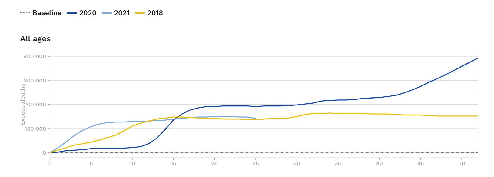 I 2020 var den totale overdødeligheten betydelig større enn 2018, nærmere 220.000 døde ifølge Euromomo. Dette er et høyt tall, men bør sees i perspektiv i forhold til totalt antall døde. Det tilsvarer rundt en måned med normal naturlig død, noe som samsvarer med nobelprisvinner Michael Levitts tidlige antagelser om dødeligheten av covid-19. Den totale overdødeligheten i 2021 er så langt lik med 2018.