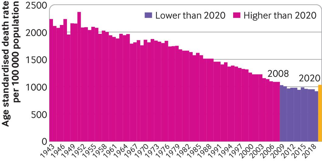 Antall døde per 100.000 standardisert til lik aldersfordeling i perioden 1943–2020 ifølge John Appleby.