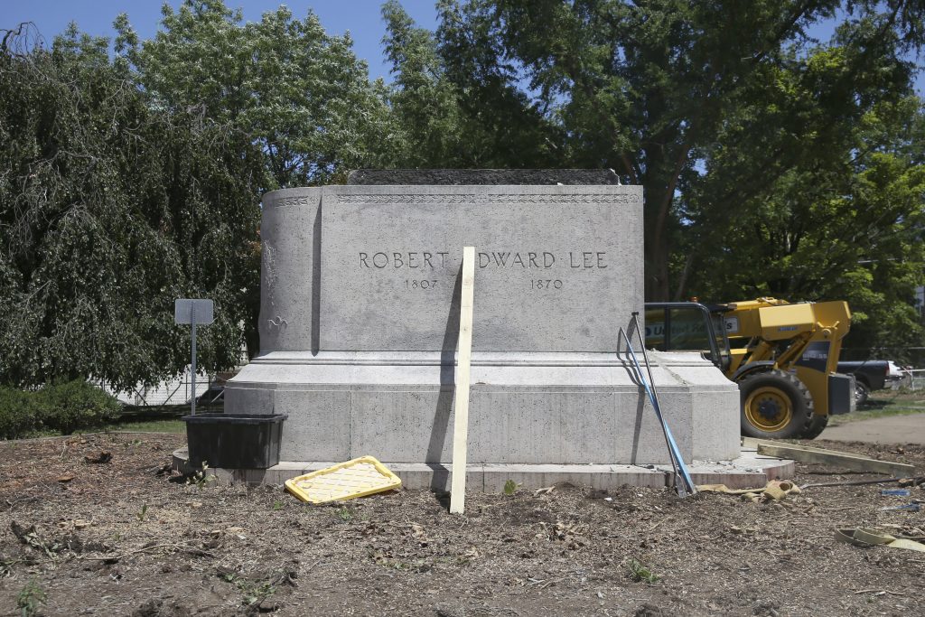 CORRECTS DATE TO JULY 13, NOT JULY 7 – Construction workers remove the base of the Robert E. Lee statue in Market Street Park on Tuesday, July 13, 2021, in Charlottesville, Va. (Erin Edgerton/The Daily Progress via AP)