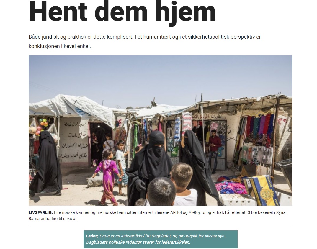 Dagbladet krever, på lederplass, at IS-kvinner med norsk statsborgerskap får reise «hjem» til Norge. Det gjelder også barna deres som er født i Den islamske stat.