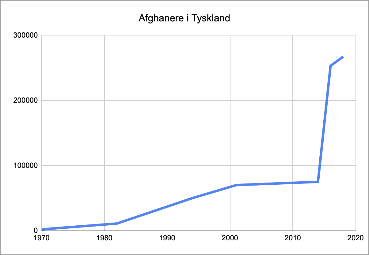 Om vi henter tall fra engelsk og tysk Wikipedia og tar disse for god fisk, ser vi at Tyskland har gått fra å ha ca. 2000 afghanske innbyggere i 1970 til det vi må anta er tett oppunder 300.000 i dag.