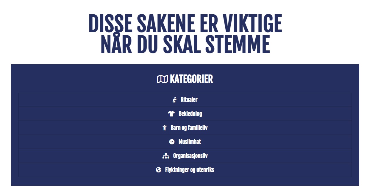 Nettsiden muslimerstemmer motbeviser muligens påstandene om at «muslimer er en like sammensatt og mangfoldig gruppe som nordmenn». Her har en rekke moskeer, foreninger, imamer og aktivister gått sammen om å «veilede» muslimer til stortingsvalget. Dette er en litt annerledes valgomat enn hva vi vanligvis ser i avisene.
