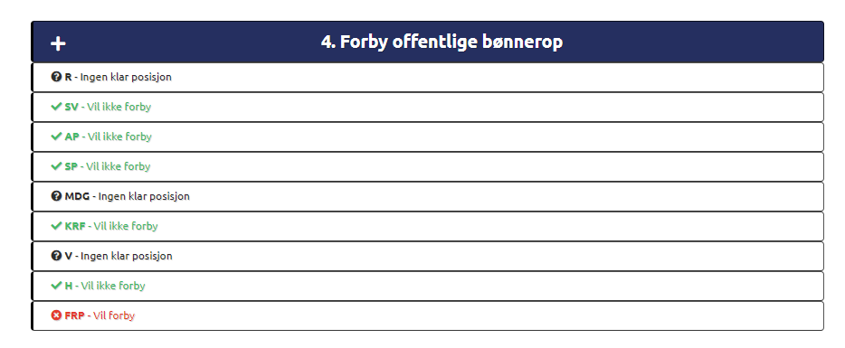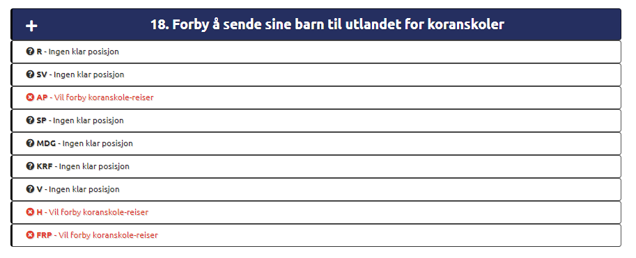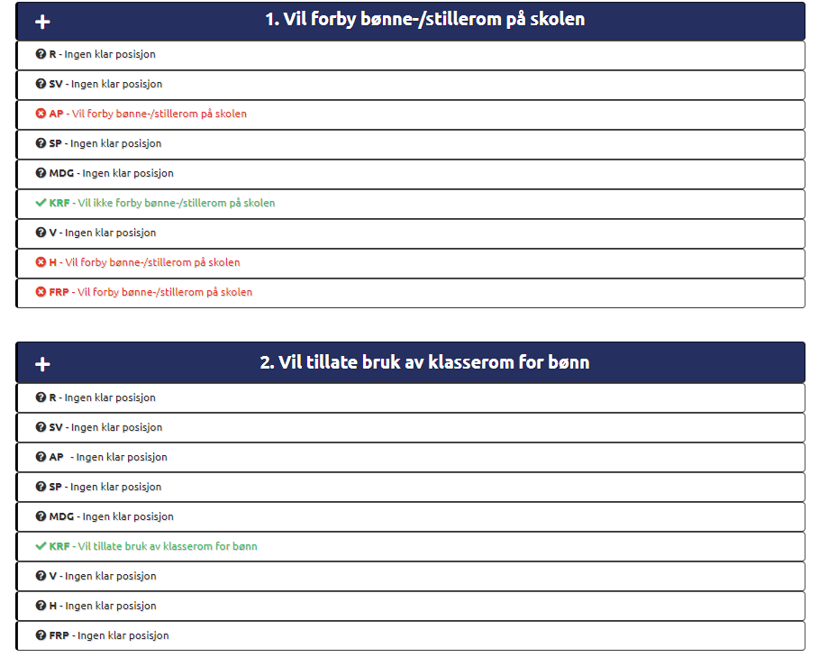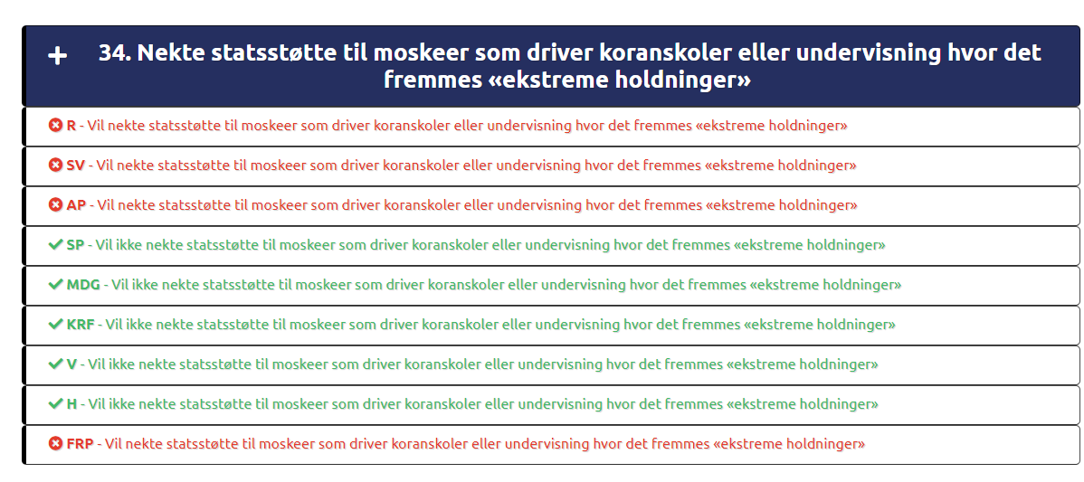 Etter denne innledningen følger en rekke spørsmål som de lærde mener er viktig for muslimer. For hvert spørsmål er alle de største partiene representert med sitt synspunkt. Det er lett å tenke seg at listen er satt opp i prioritert rekkefølge, med ritualer og bekledning som de viktigste punktene. Punkt 1. er «Vil forby bønne-/stillerom på skolen».
