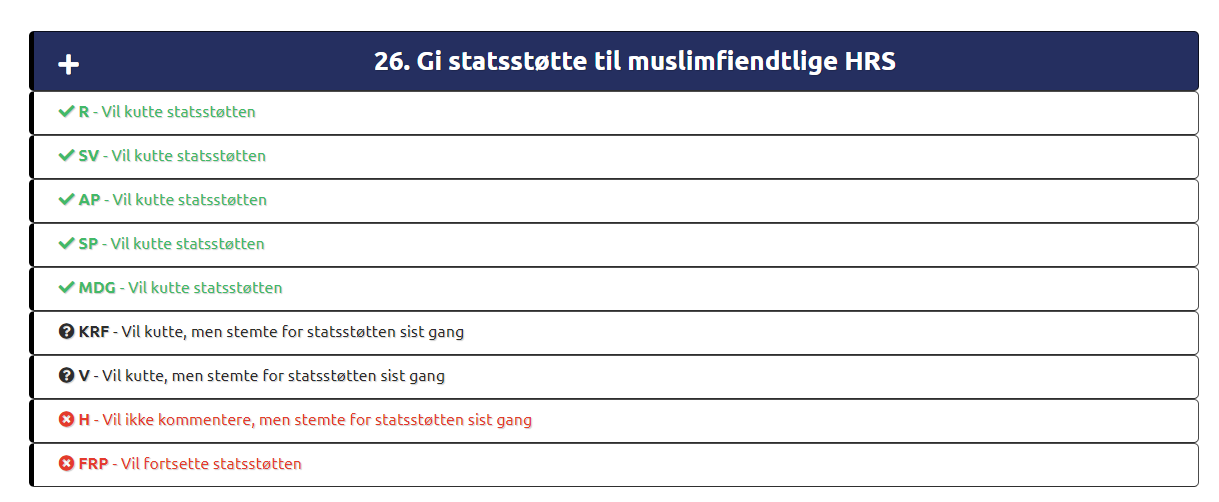 Når man stemmer på et parti så er ikke det synonymt med at man støtter det partiet. Mange stemmer på et parti fordi det konkrete partiet i deres øyne er bedre enn alternativene. Ta følgende eksempel til betraktning for å sette det på spissen:
