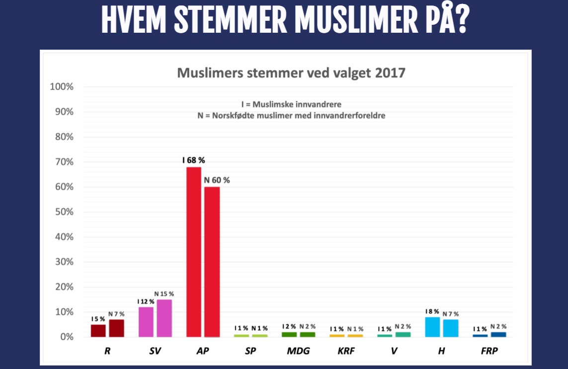 Nettsiden starter med siste stortingsvalg. Her ser vi at det er Arbeiderpartiet som får rundt to tredjedeler av stemmene. 2. generasjon muslimer stemte i litt større grad på Rødt og SV og litt mindre på Ap og Høyre. Dobbelt så mange stemte FrP, men dette er en forsvinnende liten gruppe.